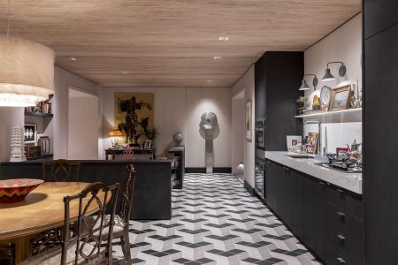 O designer de interiores Luiz Otávio Debeus criou uma junção de estampas, cores e peças em seu estúdio de 83m², que revela o estilo eclético do morador imaginário. Debeus misturou padrões de revestimento e utilizou a coleção Joy para montar o piso que remete a uma imagem em 3D.