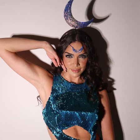 Mergulhando no universo fantástico, a influenciadora Jaque Ciocci ousou nos adereços e apostou em uma tiara de lua da Hector Albertazzi. O acessório faz conjunto com outra corrente de lua, também desenvolvida inteiramente de cristais azuis e prateados, que se ajusta sobre a testa e faz um combo perfeito.