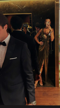 Para a noite de festa, a modelo Paolla Rahmeier apostou em um vestido de lamê dourado com fenda da grife Amissima, que traz uma proposta cool e futurística com o seu caimento e detalhes no decote V. Para dar match ao look, a famosa optou por sandálias de tiras metalizadas no dourado da Santa Lolla.