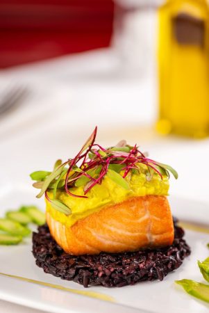 A entrada será o Salmão Santé, um prato criado pela nutricionista funcional Selma Vosgerau para o menu Santé do L’Épicerie. O Salmão Santé é grelhado ao molho de alho-poró, acompanhado de arroz negro e aspargos. O vinho branco de Monção e Melgaço, Loureiro DOC – Vinho Verde vai escoltar esta harmonização.