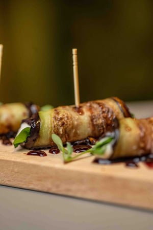 Entre as promoções, o cliente pode aproveitar a seguinte harmonização: por R$ 50, leva dois negronis e mais uma porção de Michui de berinjela. Este aperitivo traz um enroladinho de berinjela grelhada com rúcula e molho tarator, finalizada com melaço de romã. O molho tarator tem como base tahine e grão de bico, entre outros ingredientes.