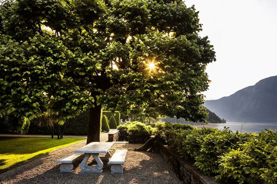 Os lugares sentados nos jardins contemplam as montanhas que circundam o Lago de Como (Foto: Cortesia de AirBnb)
