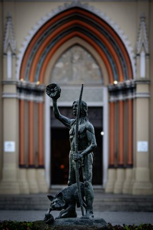 E o índio? Que índio? O índio da Praça Tiradentes! Lá está ele, altivo e forte, tendo a seus pés um lobo-guará. Escultura de Elvo Benito Damo, representa o cacique tupi Tindiquera, que, tendo estabelecido boas relações com os portugueses aqui chegados, indicou o local provável para instalar os primeiros acampamentos da região. Com seu cajado, finca o chão e profere as célebres palavras: “Coré Etuba” — “lugar de muitos pinhais”. Hoje, está posicionado em frente ao portal da Catedral.