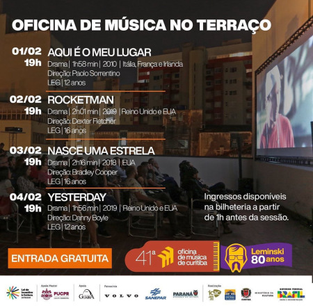 A edição de 2024 da 41ª Oficina de Música de Curitiba homenageia os 80 anos de Paulo Leminski e traz para o Terraço do Cine Passeio a exibição de 4 filmes musicais de 01 a 04/02. São eles: “Aqui é o Meu Lugar”, “Rocketman”, “Nasce Uma Estrela” e “Yesterday”; confira detalhes da programação: