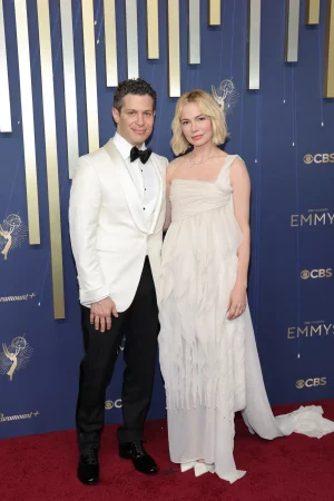 Já Michelle Williams, em Chanel vintage, surgiu ao lado do marido Thomas Kail em um visual branco combinando.