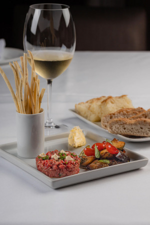 Couvert: Pães artesanais, focaccia caseira, steak tartare, legumes grelhados, manteiga fresca com ervas e caldinho do chef.