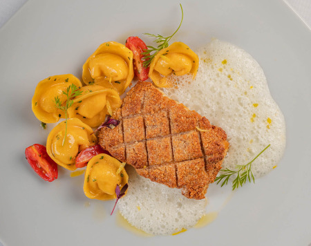 Primeiro principal: Filhote com crosta de amêndoas acompanhado de tortelli de damasco com stracciatella e espuma de limão siciliano.