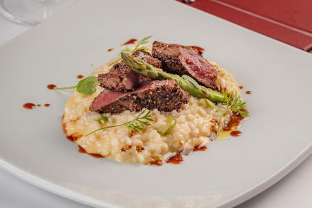 Segundo principal: Lombo de Cordeiro grelhado ao poivre, risoto de aspargos, molho roti.