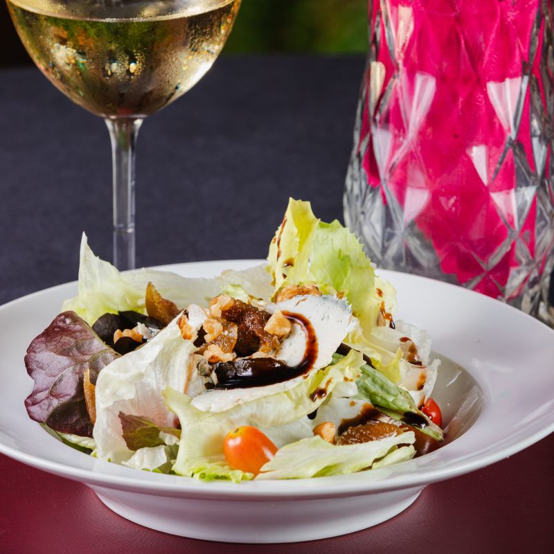 (OPÇÃO 2) Salada de gorgonzola com figos (mix de folhas verdes, gorgonzola, nozes, figos, tomates-cereja, redução de aceto balsâmico).