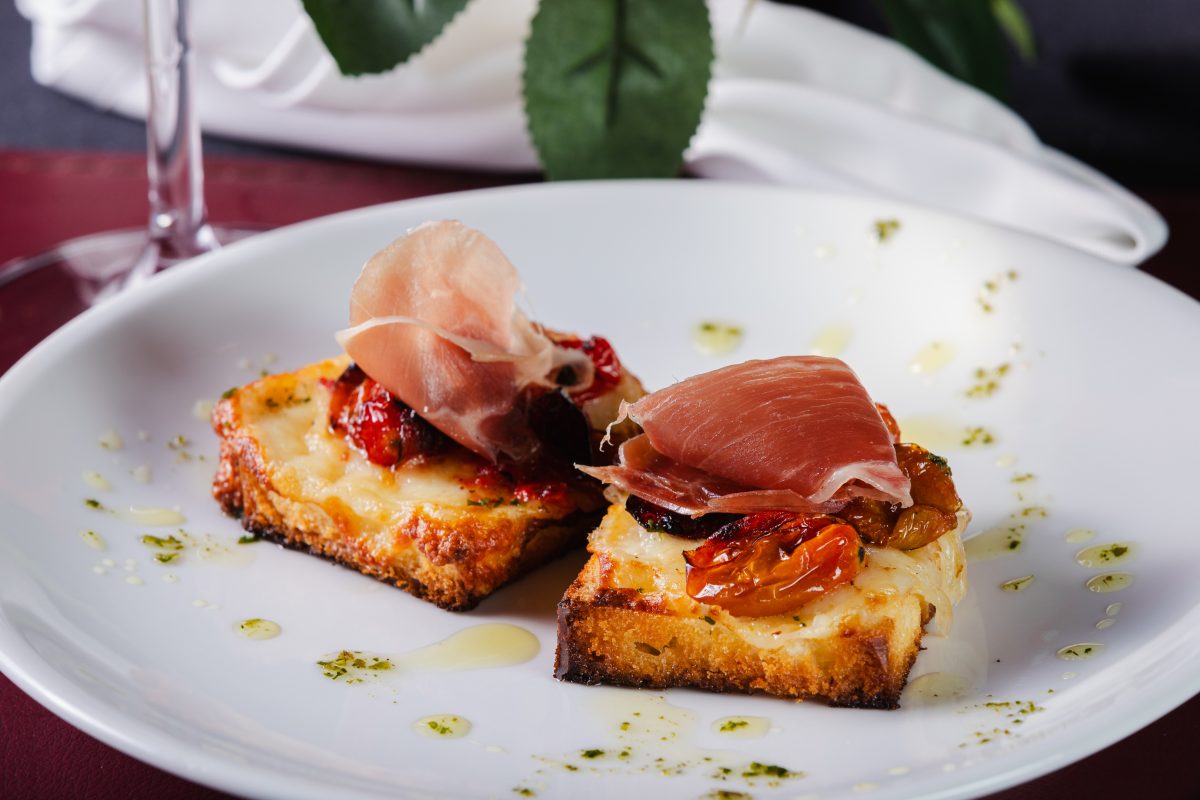 (OPÇÃO 3) Brusqueta caprese (pão italiano, mozzarella de búfala, manjericão e presunto Parma).