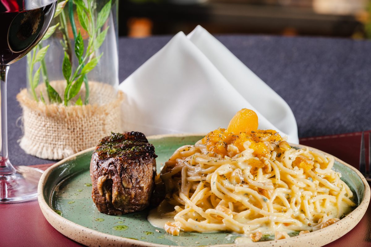 (OPÇÃO 1) Nhoque na manteiga e sálvia, ancho grelhado com molho poivre vert (nhoque de batata puxado na manteiga, sálvia acompanhada de ancho de angus, molho poivre vert e legumes grelhados).