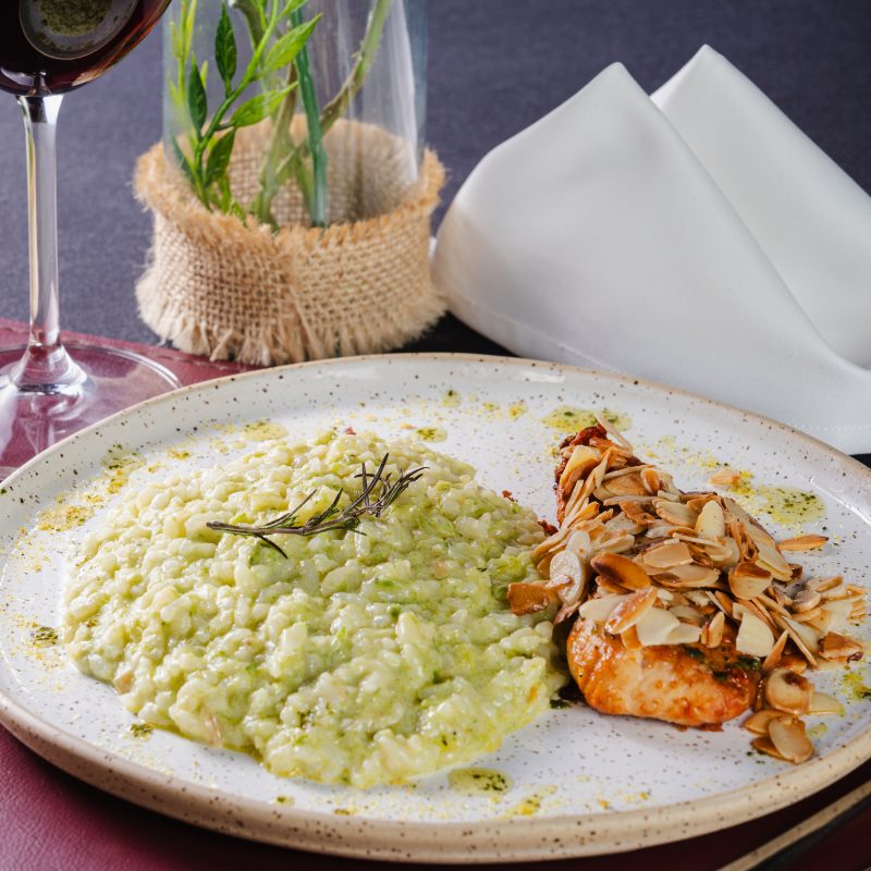 (OPÇÃO 3) Risoto de brie e alho-poró com filé de linguado em crosta de amêndoas (risoto com queijo brie, alho-poró acompanhado de filé de linguado em crosta de amêndoas laminadas).