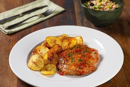 Como principais, são três alternativas: ou Frango à parmegiana com arroz à grega e batata chips, ou Assado de tira grelhado na parrilla com pappardelle ao molho de vinho, ou Filé de pescada grelhado com purê de banana da terra, farofa de castanha de caju e vinagrete de cebola roxa e pimenta biquinho.