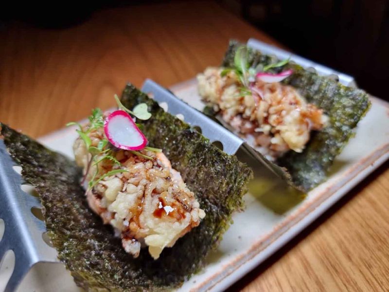 O Nori roll, por sua vez, é um tipo de temaki aberto, servido em forma de envelope, com a alga nori por fora – daí a explicação para seu nome. Tem duas opções de sabores para o recheio. Uma vem com salmão trufado maçaricado, camarão empanado e teriyaki (R$ 35). A outra leva enguia de água doce, camarão empanado, abacate, mel trufado e flor de sal (R$ 82).