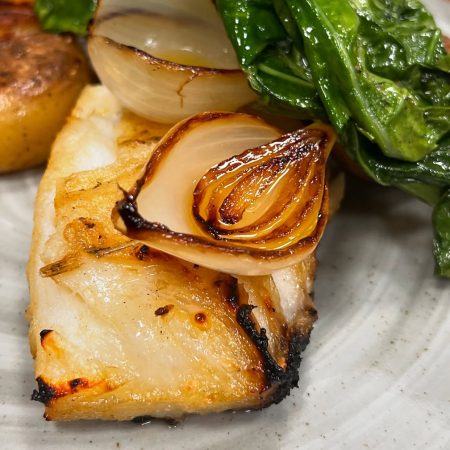 - Aqueça as cebolas e tempere com sal e pimenta do reino moída na hora. Doure as folhas de couve até ficarem bem crocantes e ligeiramente chamuscadas. No final, retire o bacalhau da churrasqueira e passe azeite de oliva novamente. Sirva com as mandioquinhas, as cebolas e a couve.