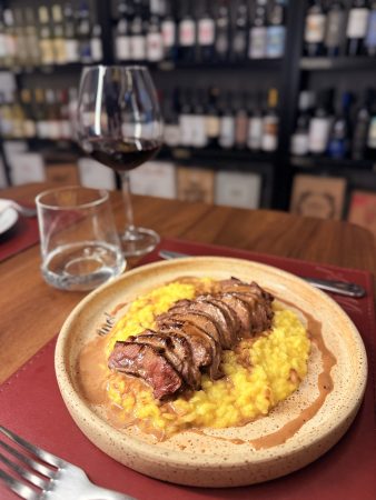 Com ambiente acolhedor e carta com mais de 300 rótulos, o Vino! oferece um prato especial para a data: filet grelhado com risoto de açafrão da terra e molho roti. A casa ainda sugere harmonizações com vinhos selecionados e prepara uma atmosfera intimista com luz suave e trilha sonora leve.