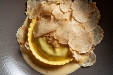 Raviolone de ricota com espinafre sobre fonduta de parmesão, finalizado com trufas frescas