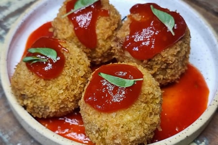 Outra pedida para dividir é o Arancini de Costela (R$ 34). Nele, os bolinhos de risoto vem recheados com costela bovina, queijo parmesão e açafrão, servidos com uma deliciosa e caseira geleia de pimenta.