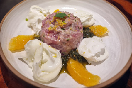Dois pratos para compartilhar abrem o cardápio. O Atum com Burrata (R$ 65) traz um tartar de atum fresco, temperado com azeite e flor de sal. Acompanha burrata fresca cremosa, gomos de laranja, molho pesto e pão da casa.
