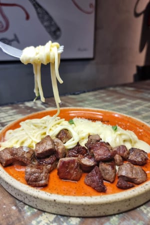 Outras duas criações inspirados na tradição italiana ampliam o segmento de pratos individuais. Um deles é o Spaghetti ao molho Alfredo com cubos de alcatra (R$ 49). O molho leva creme de leite fresco, manteiga, pimenta-do-reino moída, sal e queijo parmigiano.