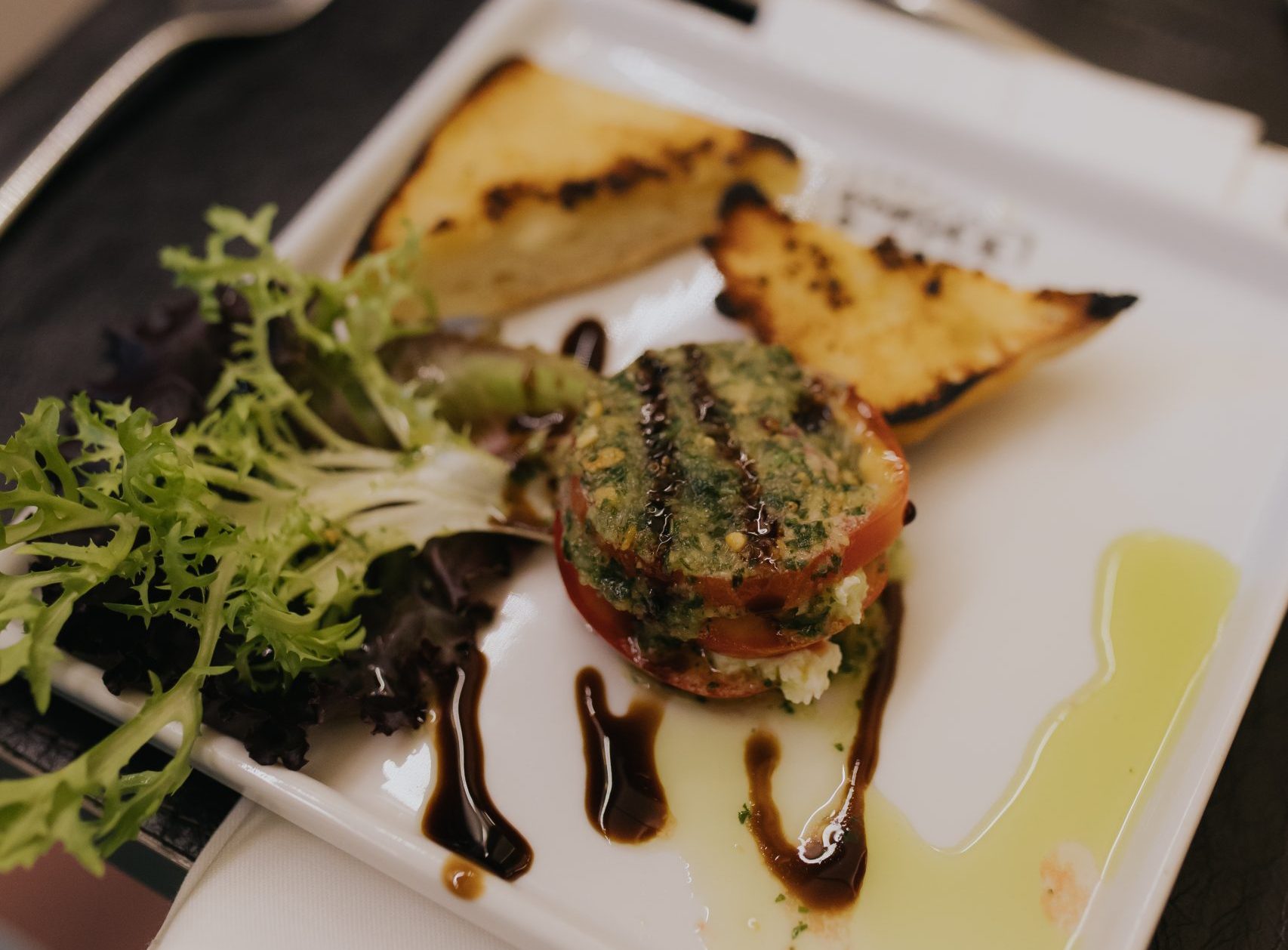 Entrada: Salada Caprese, pão ciabata com manteiga, tomate italiano, creme de queijo de búfala, azeite de manjericão, pesto de castanha de caju e mix de folhas.