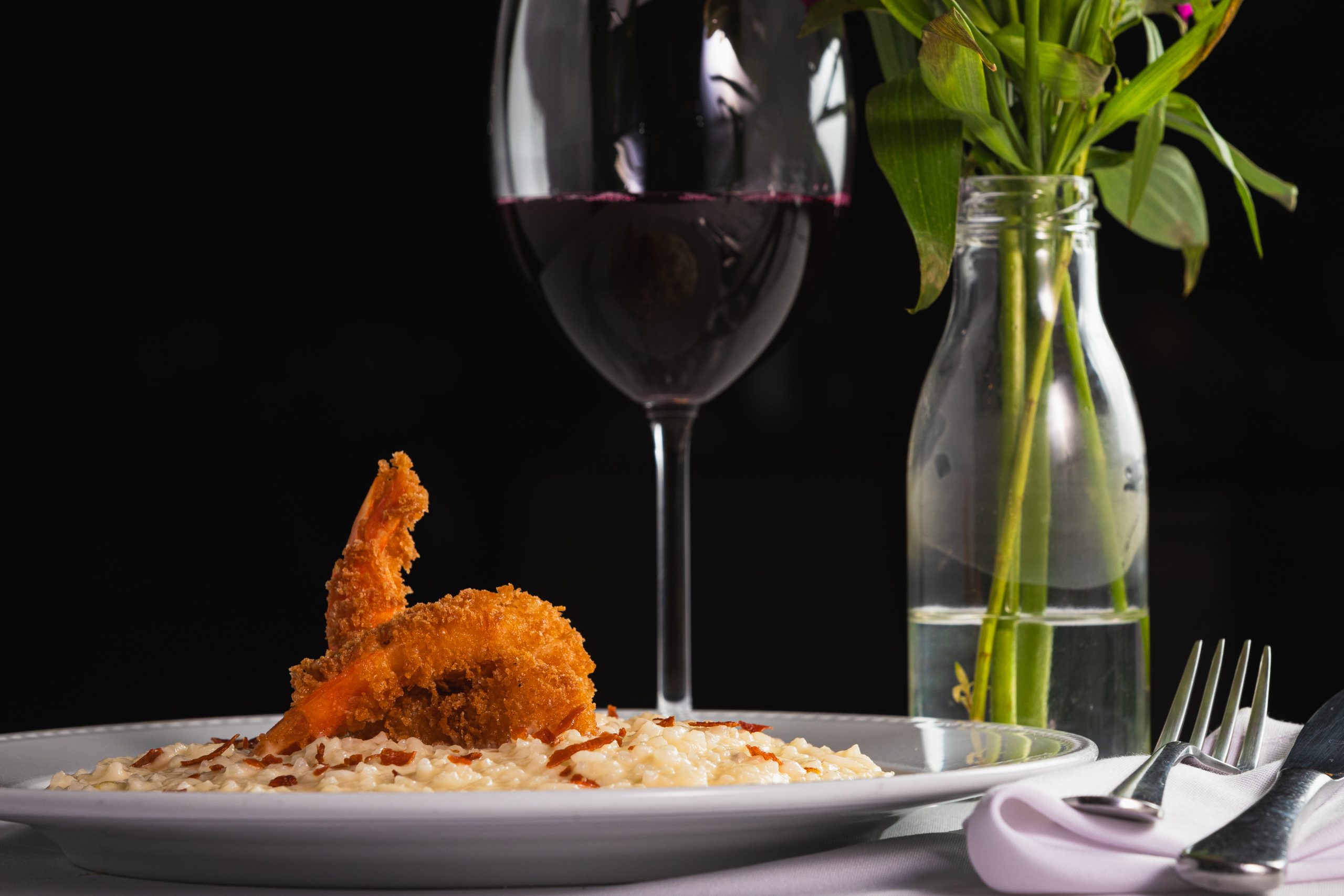 No Festival Gastronômico de Curitiba, há uma opção deliciosa de frutos do mar para os clientes aproveitarem: camarões empanados com risoto de brie e tomate confit.