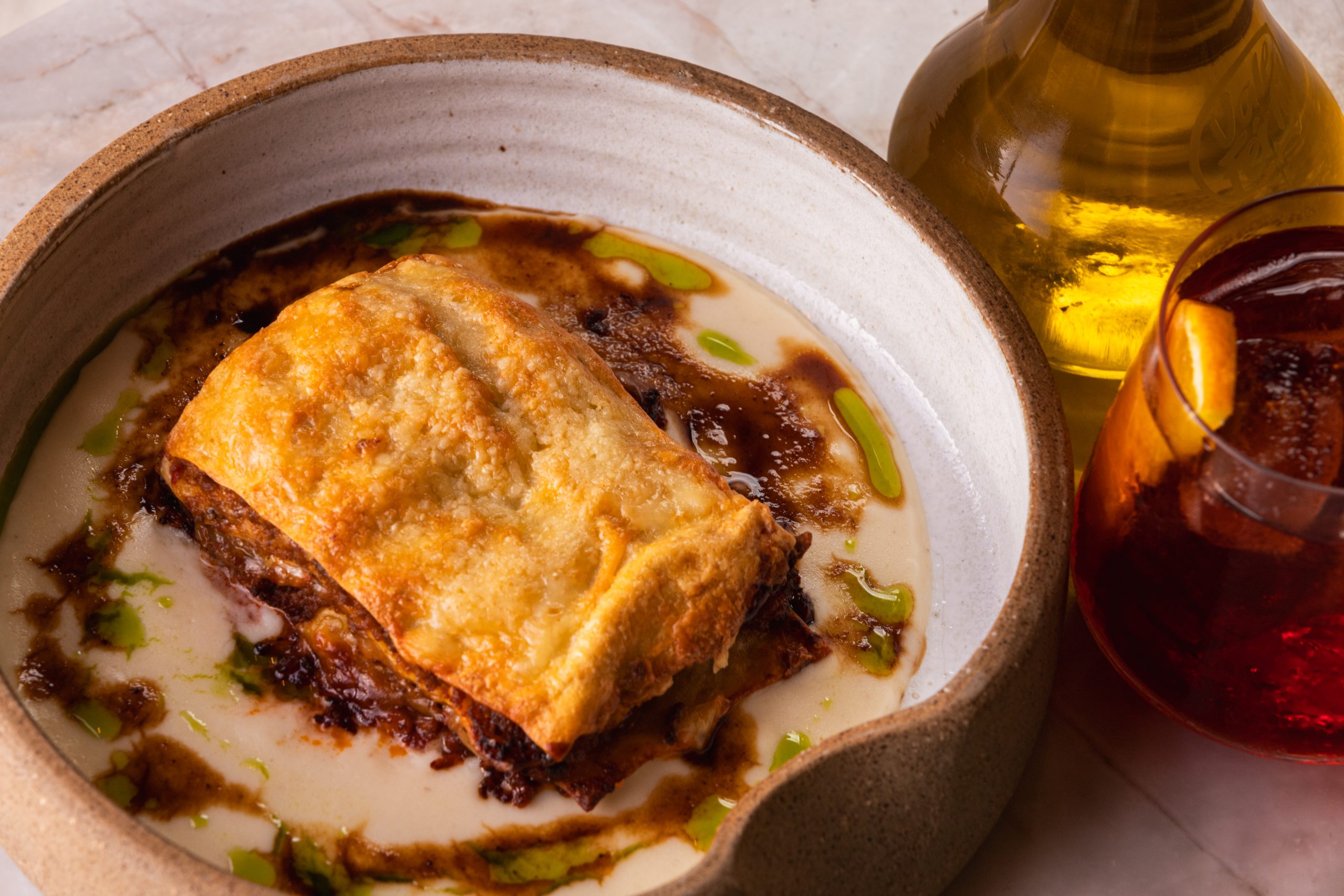 Lasagnetta ragu di carne (massa fresca, bolonhesa e fonduta de pecorino).