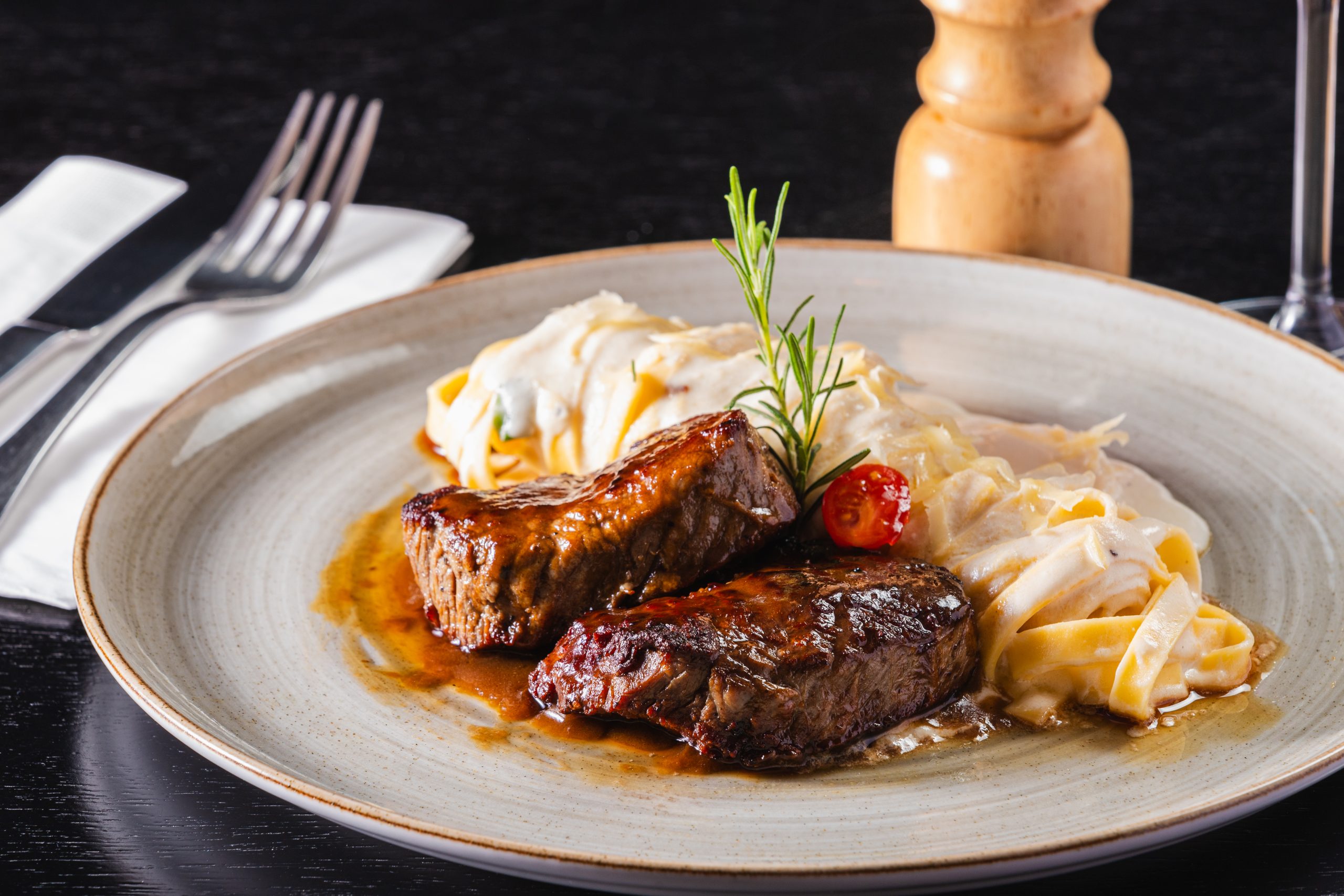 Tagliata de mignon (filé mignon grelhado e servido em fatias com redução demi glace agridoce acompanhado de fettuccine ao molho de creme de leite fresco e trufas negras).