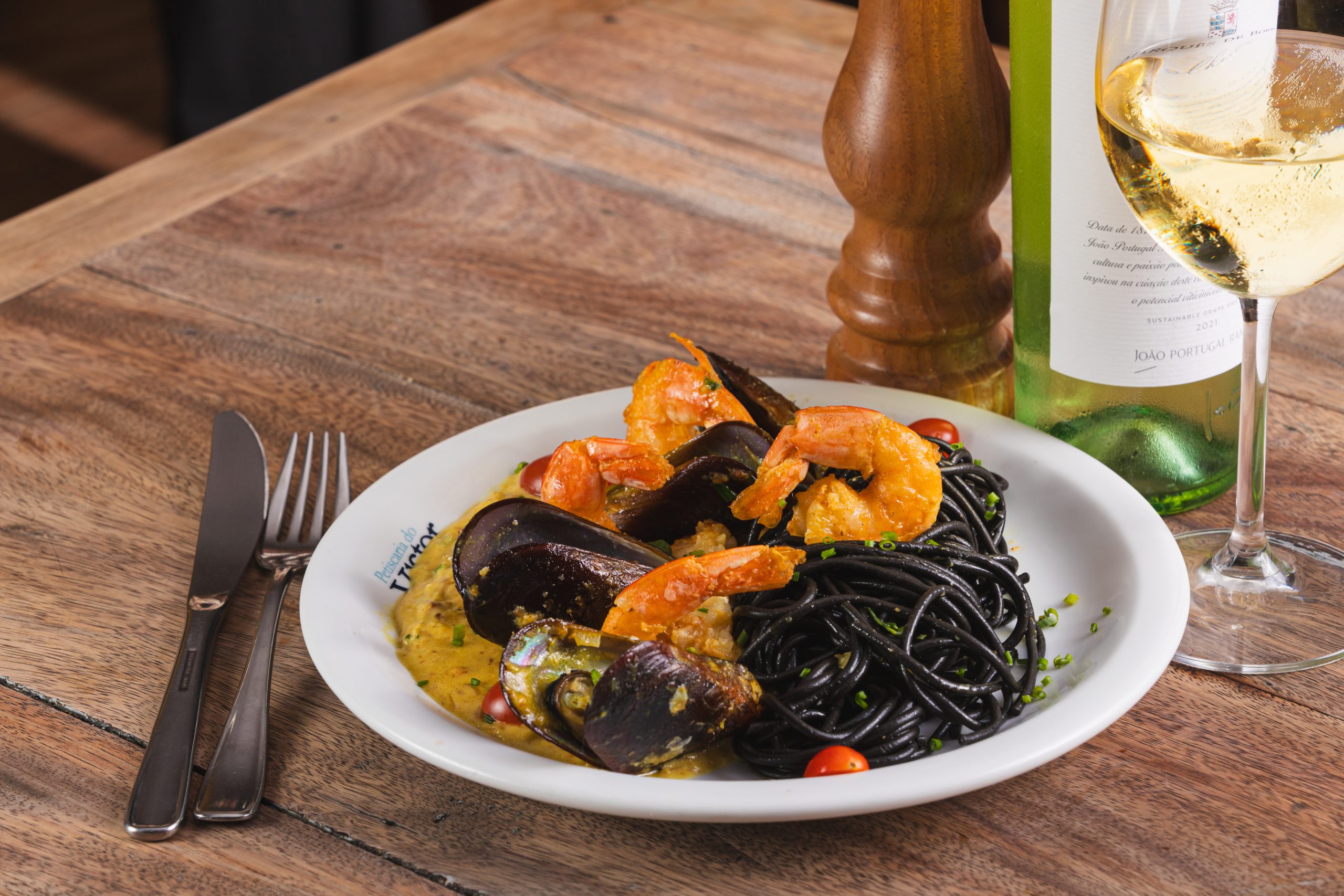Spaghetti negro com camarões (spaghetti com tinta de lula, camarão-rosa com casca, marisco, tomate-cereja, cebola, alho, açafrão, molho branco com espumante e conhaque).
