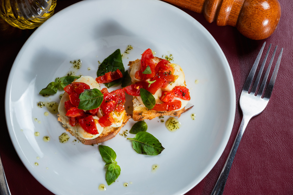 (Opção 2) Brusqueta Caprese (pão italiano, mozzarella de búfala e manjericão).