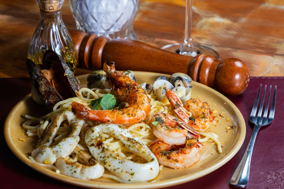 (Opção 3) Espaguete Frutti di Mari (massa fresca de grano duro e ovos, molho de salmão acompanhado de vongole, mexilhões, lula e camarões).