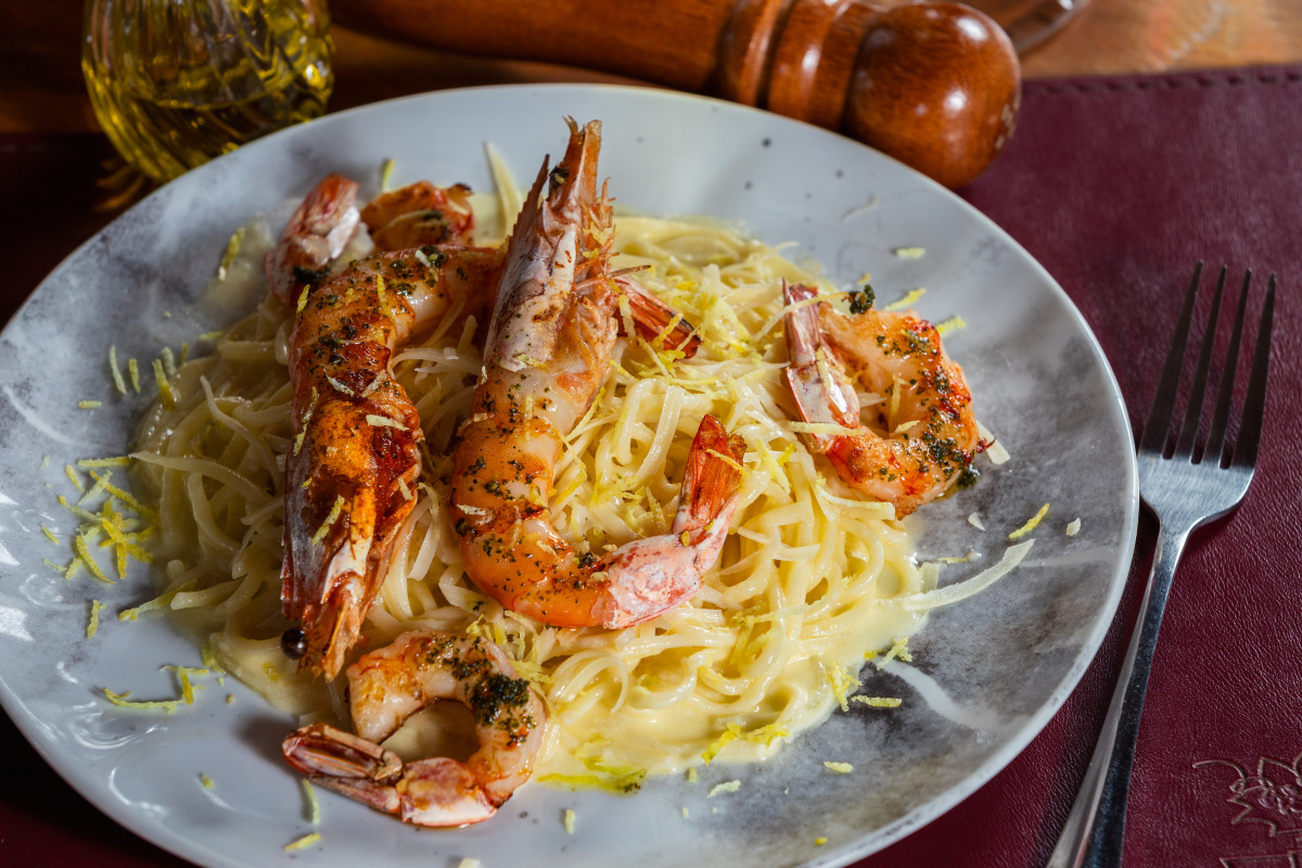 (Opção 3) Espaguete Limone com Camarões (massa fresca de grano duro e ovos, molho à base de nata fresca, parmesão, camarões, toque de limão-siciliano e camarões grelhados).