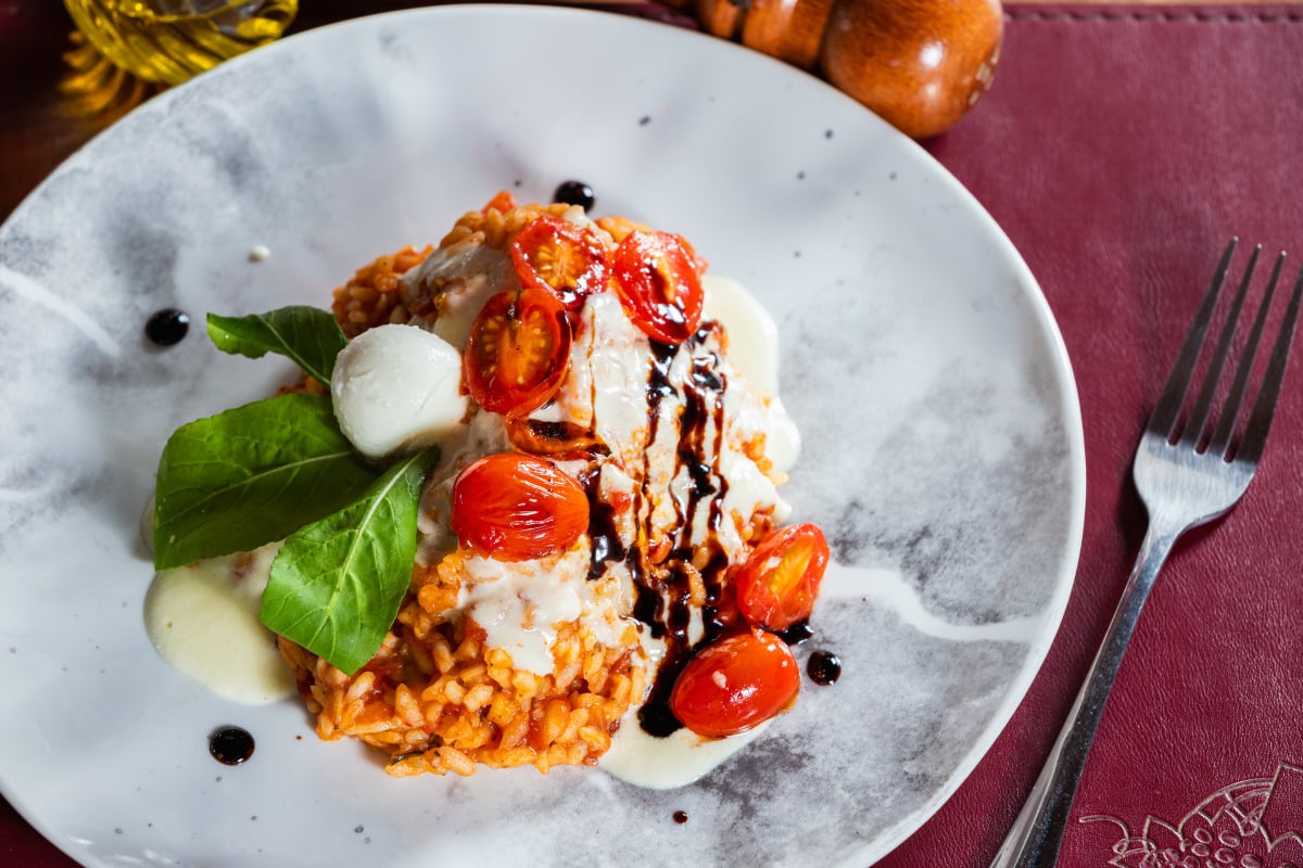 (Opção 1) VEG Risoto Caprese com Creme de Burrata (risoto à base de molho sugo, manjericão, tomates-cerejas, stracciatella e finalizado com creme de aceto balsâmico).