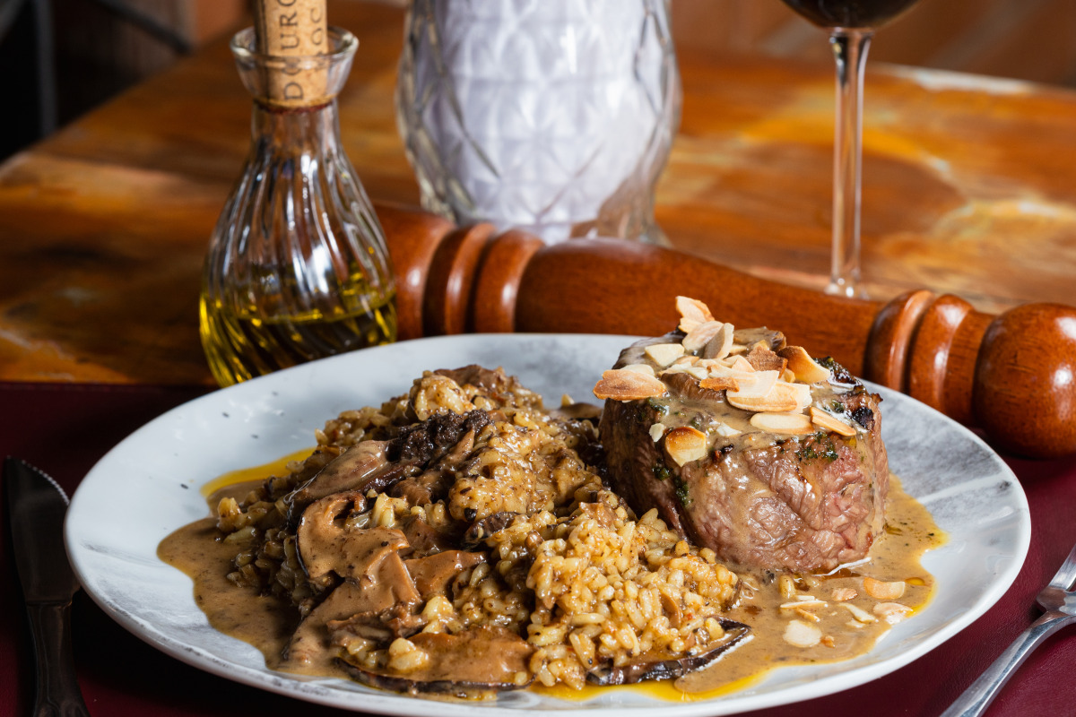 (Opção 2) Risoto Funghi Trufado com Mignon em Crosta de Amêndoas.