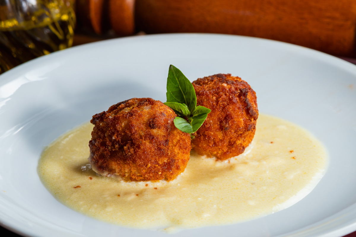 (Opção 1) Arancini de Abóbora com Carne-seca (bolinho de risoto com queijo parmesão, carne-seca e abóbora).