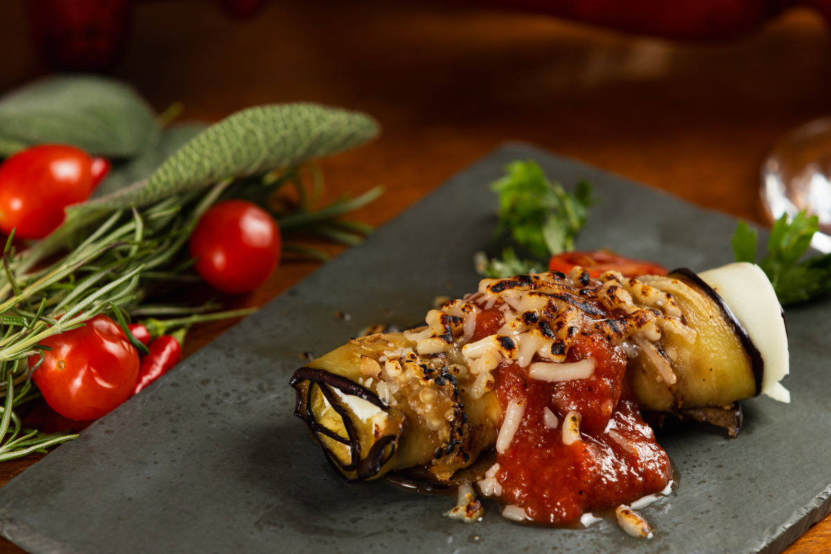 (Opção 3) VEG Melanzane Parmeggiana (berinjela à parmeggiana e molho pomodoro, gratinada com queijo parmesão).