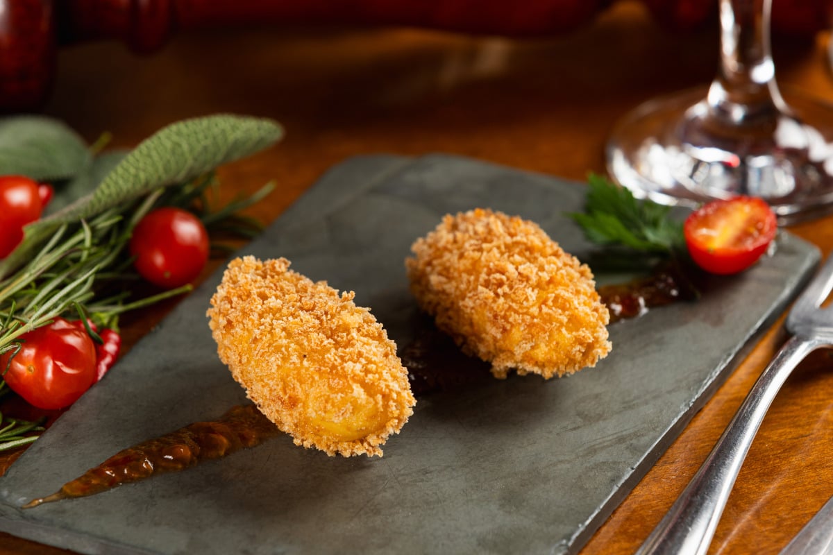 (Opção 1) Due Croquete al Blumenau (croquete recheado com linguiça Blumenau e geleia de pimenta).