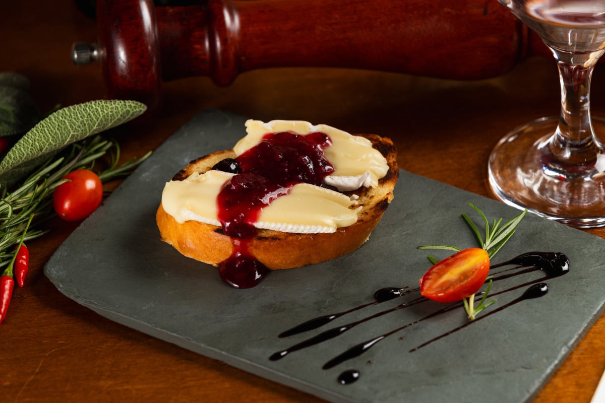 (Opção 1) Brusqueta Al Brie (brusqueta de queijo Brie e calda de frutas vermelhas).