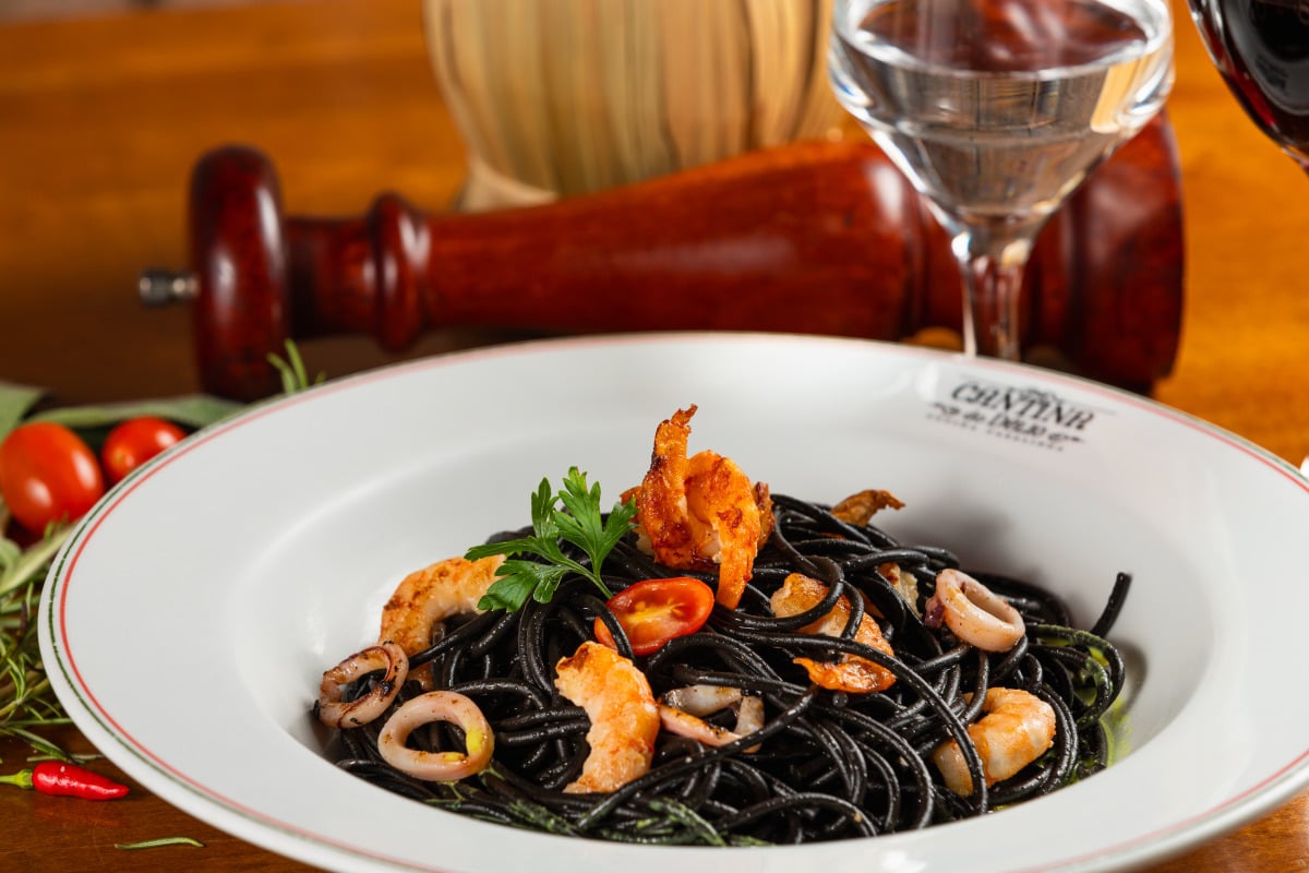 (Opção 2) Spaguet Nero di Sepia Al Gamberi i Calamari (espaguete de tinta de lula servido com camarões e lula ao molho Champanhe).