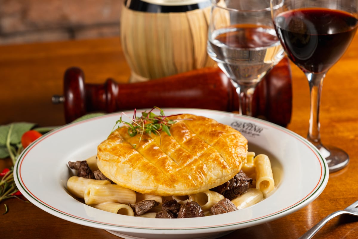 (Opção 1) Mignon em Cubos com Rigatone Alfreto e Massa Folhada (mignon com rigatone ao molho Alfredo coberto com massa folhada).
