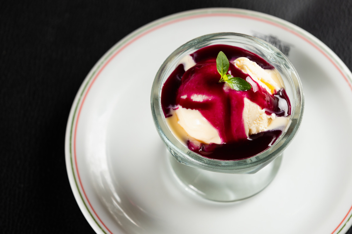 (Opção 2) Gelatto de Creme com Calda de Vinho Tinto (gelatto artesanal feito pela casa com calda de vinho tinto).