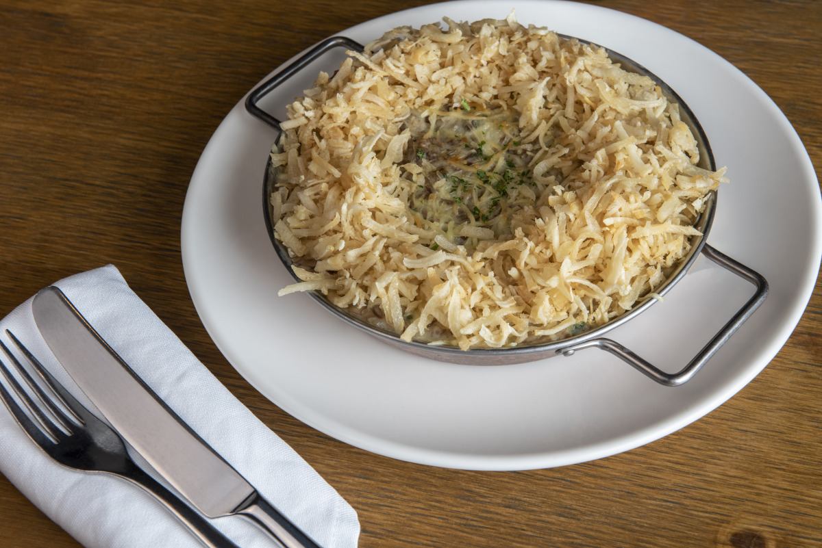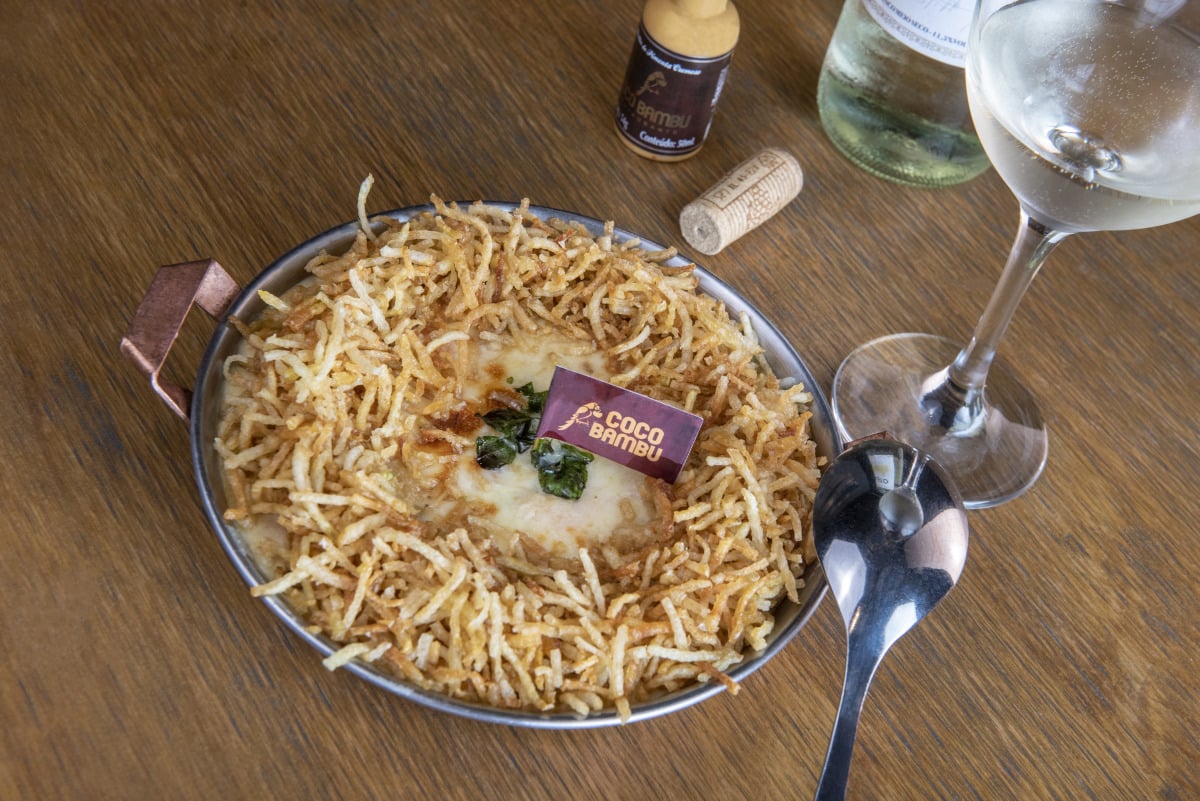 (Opção 2) Carne de Sol do Sertão (arroz de leite com queijo coalho coberto com carne de sol desfiada, refogada na manteiga da terra com cebola-roxa, nata e coentro, e gratinada com queijo coalho. Acompanha macaxeira palha frita).