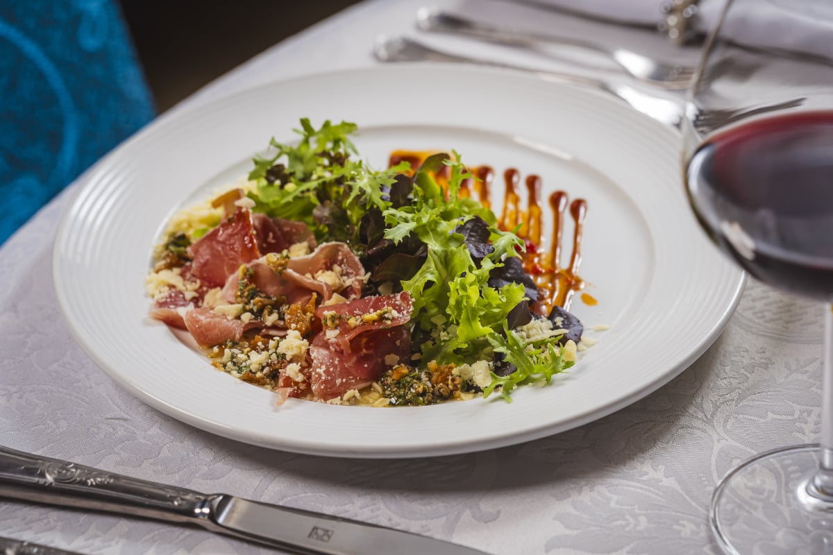 (Opção 2) Assiette Cordon Blanc (mix de queijos, presunto espanhol, pistou francês e croûtons, acompanhado de mix de folhas verdes e roxas, temperadas com vinagre francês à base de mostarda Dijon, azeite de oliva, aceto balsâmico e mel).
