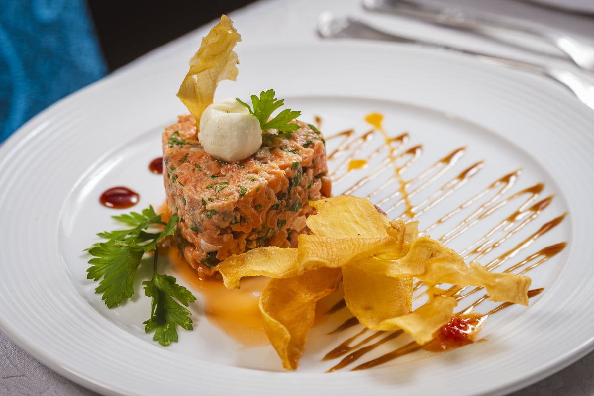 (Opção 1) Tartar de Salmão (tartar de salmão fresco, finamente picado na faca, temperado com especiarias e molho de ostras, finalizado com queijo boursin acompanhado de chips de batata-doce).