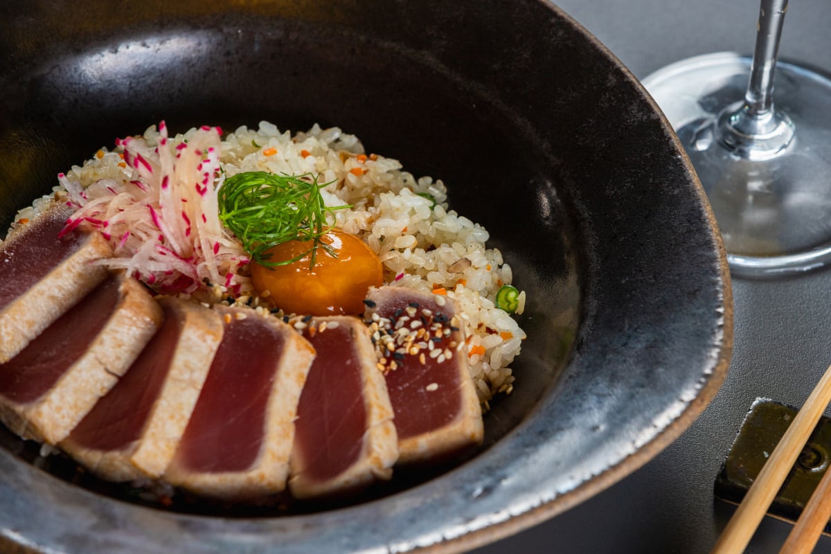 Zuke Don (peixe marinado servido com chahan de cogumelos e legumes, gema curada e molho à base de dashi).