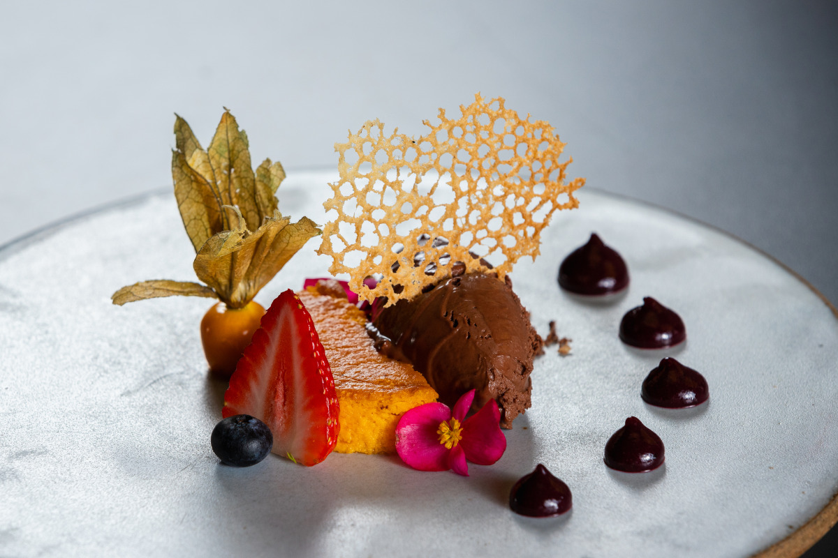 Cabotiá Cake (torta de abóbora cabotiá servida com mousse de chocolate belga, calda de frutas vermelhas e terra de cacau 100%).