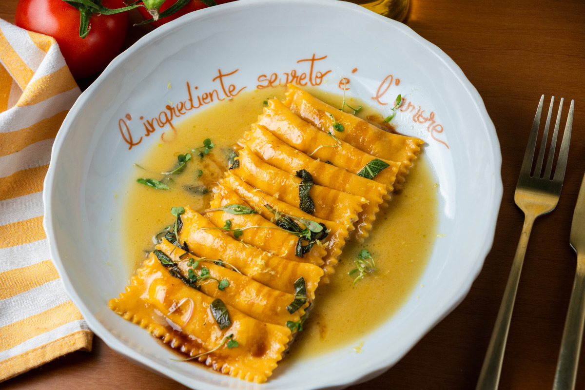 (Opção 2) Doppio Ravioli (ravióli duplo com recheio de ossobuco e ricota com limão-siciliano e nozes, salteado em uma emulsão de manteiga e sálvia).