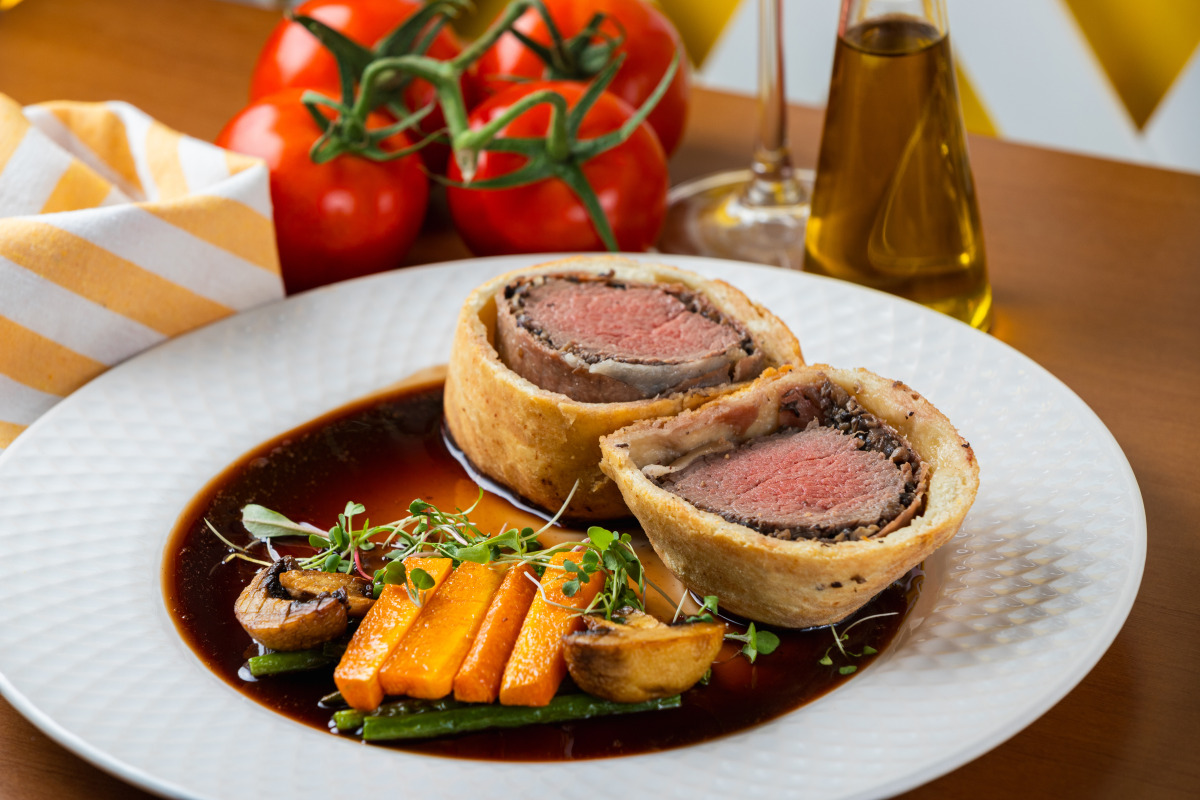 (Opção 1) Bife Wellington Mia (filé envolto em massa de pizza com duxelles de cogumelo, presunto de Parma e mostarda amarela, guarnecido com vegetais e demi glacê).
