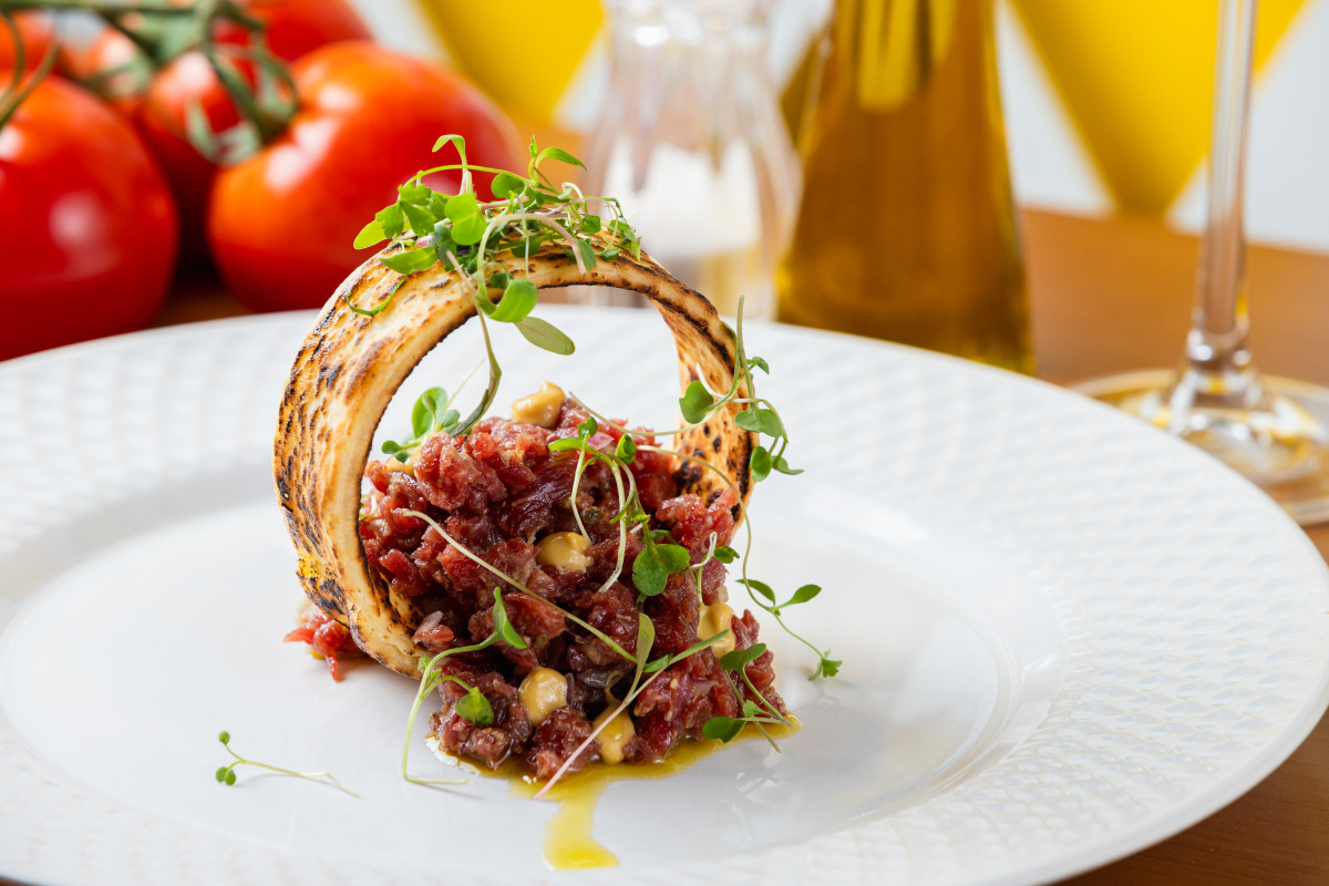 (Opção 1) Batuta di Manzo (mignon batido na ponta da faca, cebola-roxa, azeite, alcaparras e mostarda de Cremona).