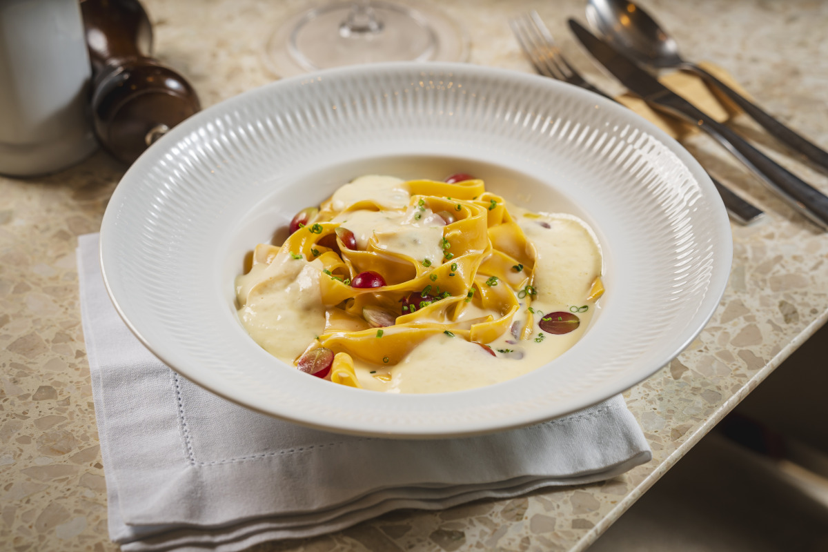 (Opção 3) Pappardelle à Veronese (massa papardelle artesanal, molho de queijos, uvas frescas e praliné de semente de abóbora).